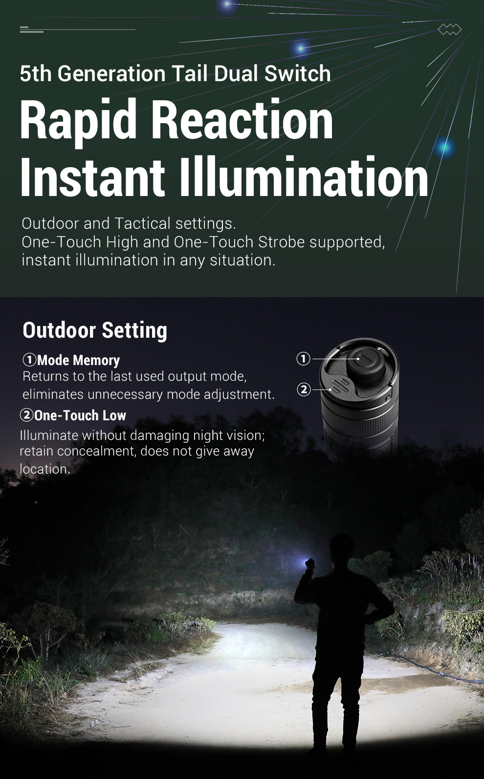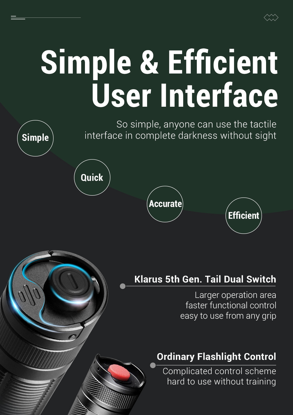 Patent Tail Dual-Switch: One-touch High/one-touch moonlight /Estroboscópio de um toque. O Tail Dual-Switch de quinta geração, patente exclusiva da Klarus, melhor ergonomia, oferece controle rápido para acender quando está escuro.