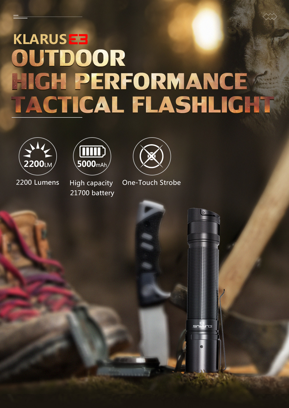 E3 é um P&D de lanterna tática externa com bateria 21700 da Klarus. É o artesanato mais avançado de Klarus "E" Series . Adota LED CREE XHP70.2 P2 importado. O brilho máximo pode chegar a 2.200 lúmens, a distância máxima do feixe é de 230 metros, o tempo de execução máximo é de 240 horas. Esta lanterna usa o mais recente 5º interruptor de cauda dupla desenvolvido por Klarus, que é mais fácil de operar em comparação com o 4º. Um toque alto, estroboscópio de um toque, resposta rápida; Corpo compacto, de alto desempenho, esta lanterna é totalmente competente para sobrevivência ao ar livre, técnica, aplicação da lei, EDC, camping, autodefesa e outros cenários. E3 faz você não ter medo da noite!