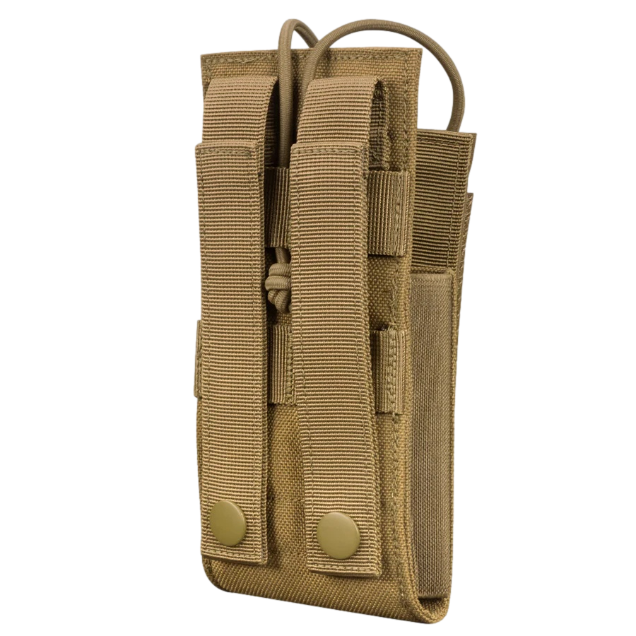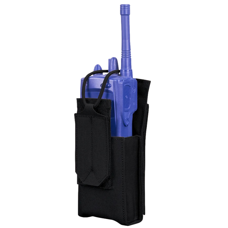 Acomodará a maioria dos rádios portáteis de segurança pública Design de topo aberto com revista segura de corda elástica Lados elásticos para acomodar rádios mais largos Compatível com MOLLE